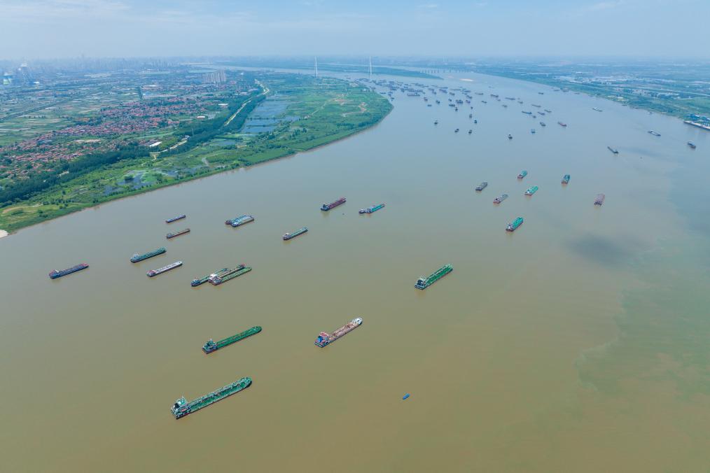 7月5日,船只在武汉阳逻港区水域行进(无人机相片)。新华社记者伍志尊 摄